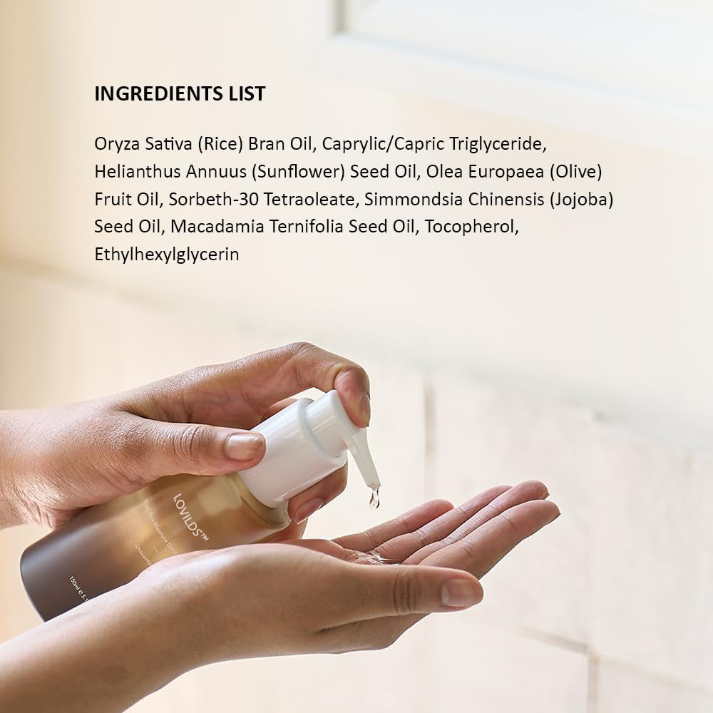 LOVILDS⢠Black Rice Moisture Deep Cleansing Oil is designed to melt away daily build-up with ease. It effectively removes SPF, dirt, makeup, impurities, and excess oil without ever stripping or drying your skin. The lightweight formula rinses clean, leaving your complexion refreshed, balanced, and comfortably hydrated after every wash.